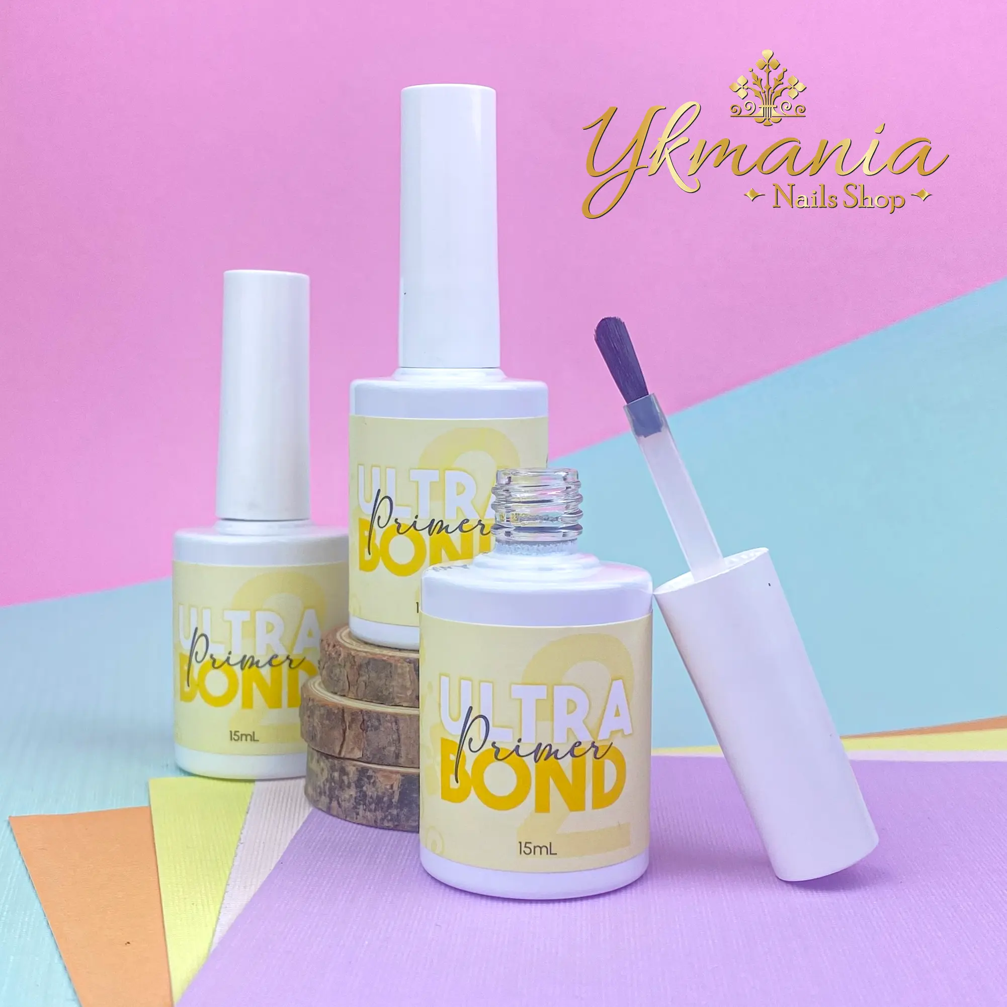 - ULTRA BOND PRIMER YKMANIA (paso 2) Se aplica después del PH BOND (paso 1) y antes de aplicar la base. Actúa como una capa adhesiva entre la uña natural y el sistema artificial lo que reduce el riesgo de desprendimiento.